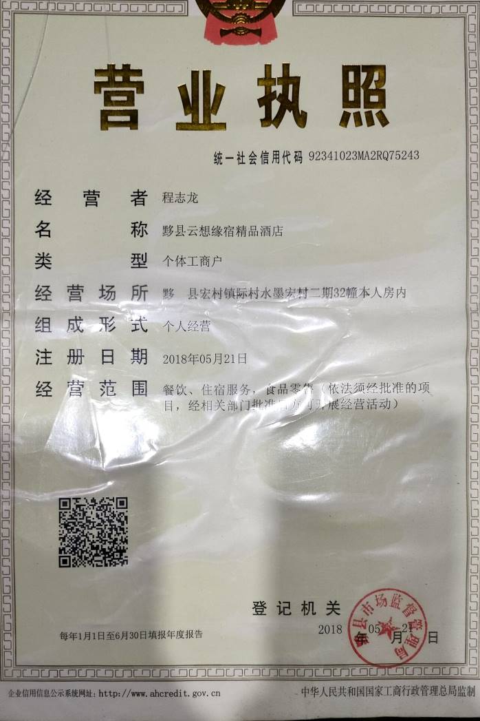 宏村云想缘宿营业执照已上传本站。点此营业执照可查看。